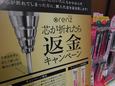 同社発表によると、キャンペーン期間中に対象商品を購入し、正しい使い方で使用したにもかかわらず筆記中に芯が折れてしまったものを対象に、現物、レシートと専用用紙を送ってもらうことで、購入代金と応募時の切手代金を普通為替証書で返金する。