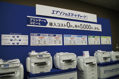 スマートチャージは、昨年8月に提供開始した導入コストゼロのプリントサービス。エプソンから貸与された同サービス専用モデルを使用でき、インクなどの消耗品(用紙は含まず)や保守サービスも基本使用料金に含まれるオールインワンプラン。