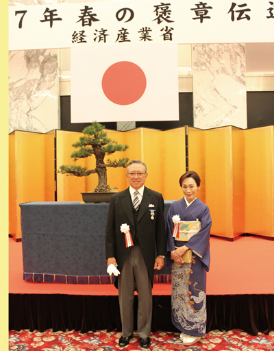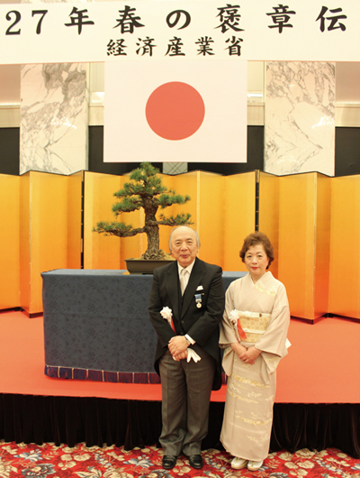 平成27年春の褒章伝達式が、5月15日、東京芝公園のザ・プリンスパークタワー東京で行われ、文具業界から、藍綬褒章を受章した宮本彰氏と原田政樹氏がそれぞれ夫人を伴い、晴れやかに臨んだ。