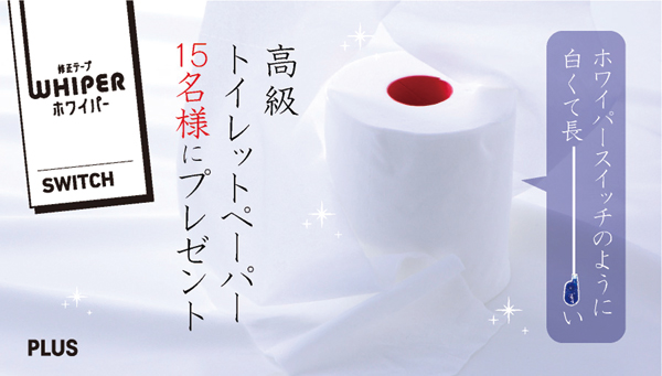 2月28日の「ホワイパースイッチ」新発売を記念して、公式Twitter(@plus_bungu)をフォロー&リツイートするだけで、抽選で15名に、修正テープの様に白くてなが~い高級トイレットペーパー「うさぎ」が当たるTwitterキャンペーンを実施する。