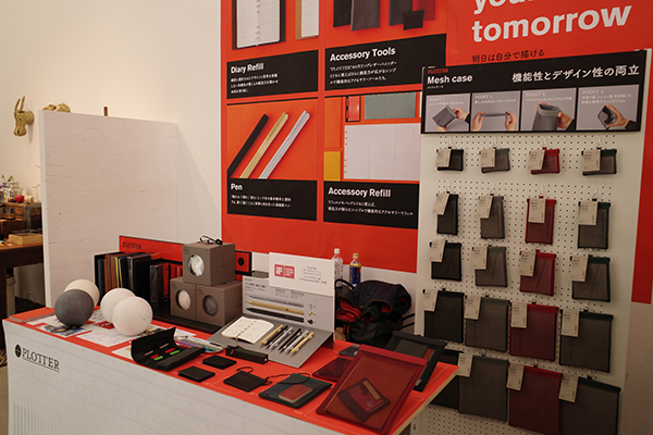 PLOTTER(デザインフィル)は、「システム手帳にプラスオンすることで機動力がアップし創造力が膨らむ」アクセサリーツールとして新しく発売したGlobe(地球儀)やメッシュケースなどを展示。