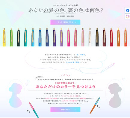 2019年、国内出荷本数が過去最高の200万本を記録。それを記念に「クリックゴールド ブランドサイト」を立ち上げた。当サイトでは、「色」をテーマにし、18色展開するボディカラーはもちろん、組み合わせ自由なカスタマイズ方法などを紹介。特に「色」を個性として大切にする女子高生や女子大学生に向けて、見て思わずワクワクするようなカラフルなサイトデザインに設計されている。