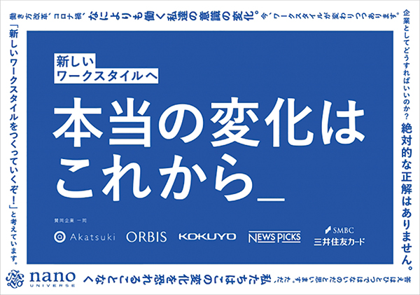 コクヨ(黒田英邦社長)は、ナノ・ユニバース(東京渋谷区)が掲げる、今まで常識とされてきたワークスタイルやライフスタイルを変化させていくきっかけ作りの主旨に賛同し、7月6日から「#本当の変化はこれから_」プロジェクトに参画、変化に対して考えるきっかけ作りを応援している。
