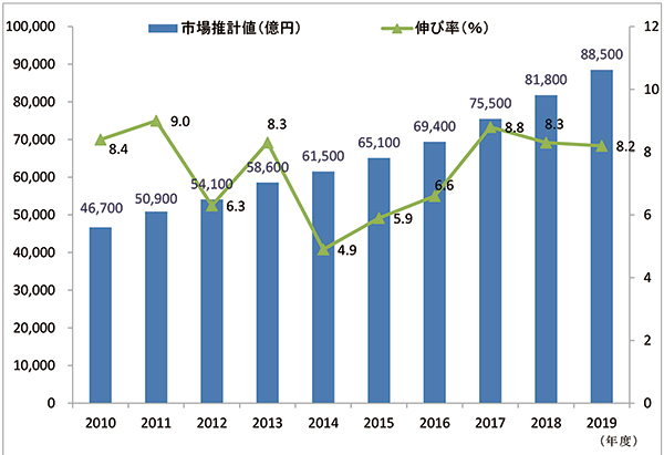 マイナス成長を記録した1998年度以来、21年連続して増加傾向が続き、直近10年の平均成長率は7.5%で、10年前に比べて約2倍の規模に拡大している。