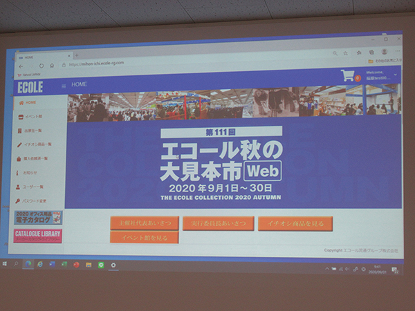 広域文具流通のエコール流通グループ(ERG、一ノ瀬厳社長)は、9月1日、東京・中央区の本社で記者発表を行い、新型コロナウイルスが収束をみない状況の中、9月に予定していた「エコール秋の大見本市」を中止し、販売店の商品情報ニーズに応えるべく、9月一か月の期間を設け、大見本市専用のサイトを立ち上げ、初のWeb見本市を開催すると発表した。