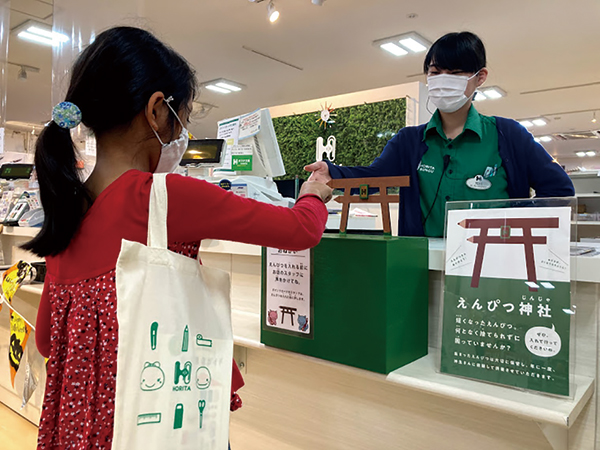 一定の鉛筆を店舗に持参すると、エコバッグをプレゼントする仕組み。鉛筆を大事に使い、使い終わった鉛筆に感謝をすることで、モノの価値に少しでも気づいてくれればと取り組んでいる。
