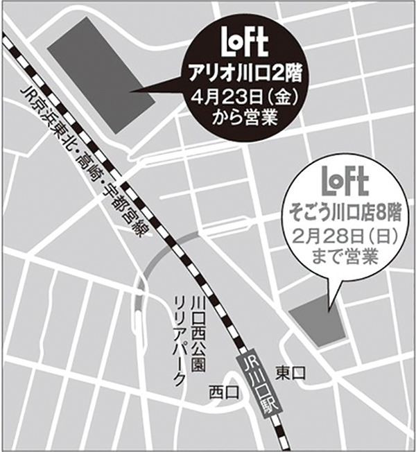 ロフト(東京都渋谷区)は、2月末日でのそごう川口店(そごう・西武)の閉店に伴い、川口ロフトの営業を終了し、2021年4月23日(金)より新・川口ロフトとして、アリオ川口店2階に移転、オープンする。