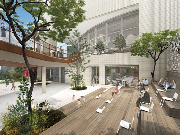 「みんなのワーク&ライフ開放区」をコンセプトに、自社のオフィスに加えて、お客様や地域住民が利用できるエリアを併設する。