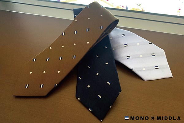 ネクタイは、MONOの3色ロゴマークとMIDDLAのアイコンMIDDLAPPLE(落ちないリンゴ)をドット状に刺繍した100%シルク生地。カラーは、SAXE、NAVY、BROWNの3色。