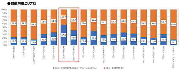 都道府県エリア別のテレワーク制度の導入率は、東京都が最も高く、57.3%。続いて、神奈川県の41.8%。最も低いのは北関東・甲信の15.8%だった。