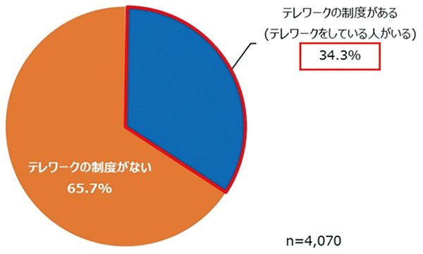 今回アンケート回答者による、テレワーク制度の導入率は34.3%で、従業員規模別では、規模が大きくなるにつれて、導入率が高くなる傾向にあった。