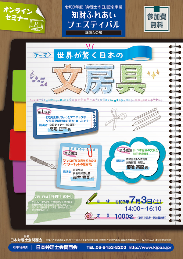 日本弁理士会関西会は、7月1日の「弁理士の日」を記念して、7月3日(土)に「知財ふれあいフェスティバル/講演会の部『世界が驚く日本の文房具』」をオンライン形式で実施する。