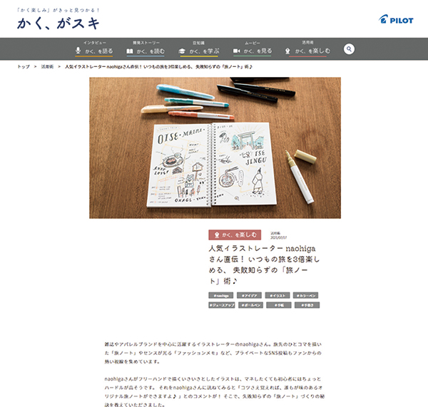 その他、「かく、を見る」ではインキの色の美しさを表現した動画、「かく、を楽しむ」ではイラストレーターnaohigaさんによるおしゃれな「旅ノート」術など、書くことが楽しくなるコンテンツを用意する。