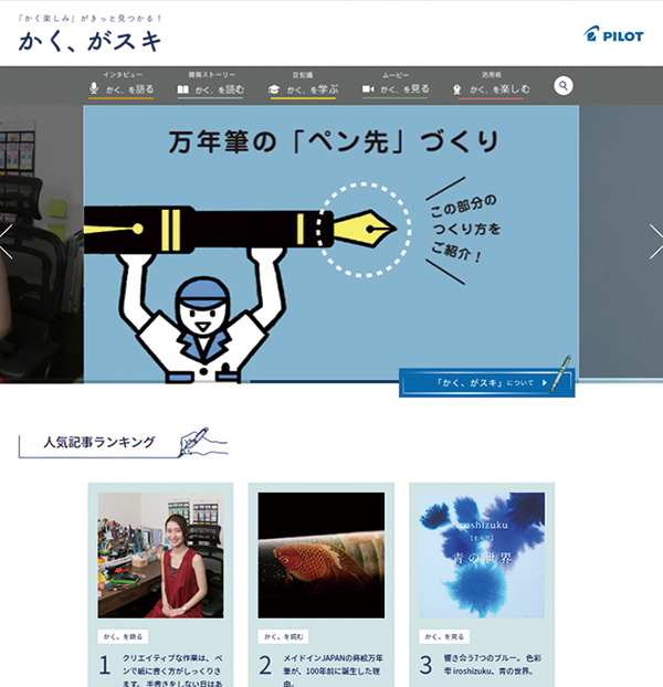 パイロットコーポレーション(伊藤秀社長)は、手書きの楽しさ、喜びを伝えるために筆記具に関する様々なコンテンツを発信するWEBメディア「かく、がスキ」を7月29日から開設した。