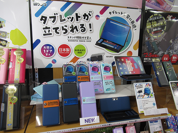 新入学商戦の軸となるマグネット筆入れ(8月~11月)では、業界初の中身が見えるマグネット筆入れ「タフクリア筆入れ」(6点)、GIGAスクール構想に対応する、タブレットが立てられる筆入れ「タツール筆入れ」(4点)、プリンセスプックリ柄、恐竜プックリ柄、星座蓄光柄、国家大百科柄を用意する「ピッタントン筆入れ」(4点)。その他、タフキング、ロイヤルプリティ筆入れ、PUMA筆入れ(3点)、アニマルアップリケ付き筆入れ「ふわもこあにまる筆入れ」(3点)。