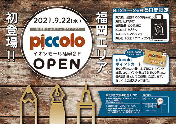 「piccolo(ピコロ)」とは「小さい」や「かわいい」の意味。おしゃれでかわいい文具と7,000種類を超える筆記具を地域トップクラスで品揃えする。見てワクワク、触ってドキドキ、使って楽しい、思わず欲しくなってしまう、ユニークなステーショナリーをお客さまへ提案する。