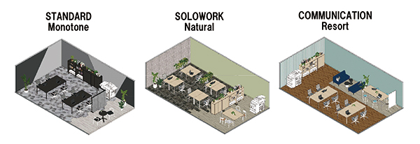パッケージのメインメニューとして、“働き方レイアウト3種×デザインテイスト6種”の全18種類を用意する。各パッケージには内装(床材+壁材)+家具が含まれる。