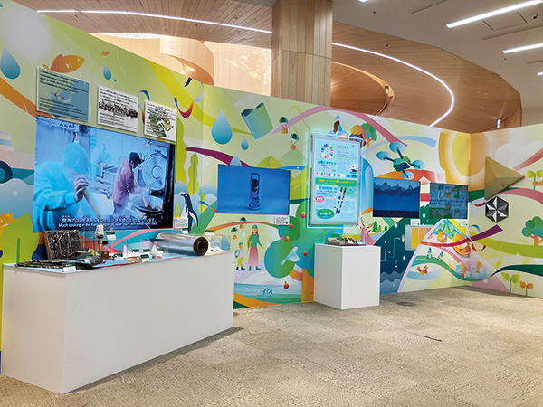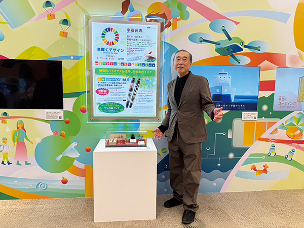 「幸福寿命の実現を目指して」をテーマに展開し、輪島塗ボールペン「雅風」と、パームヤシの実オイルを採用したバイオマスの世界初インク「ヤシの実インク」の実物を展示している。