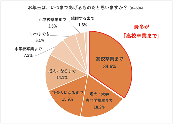 お年玉をいつまであげるかについて、「高校卒業まで」が34.6%で最多。そして今年は 「社会人になるまで」 とする回答が増え、意識にやや変化が見られた。